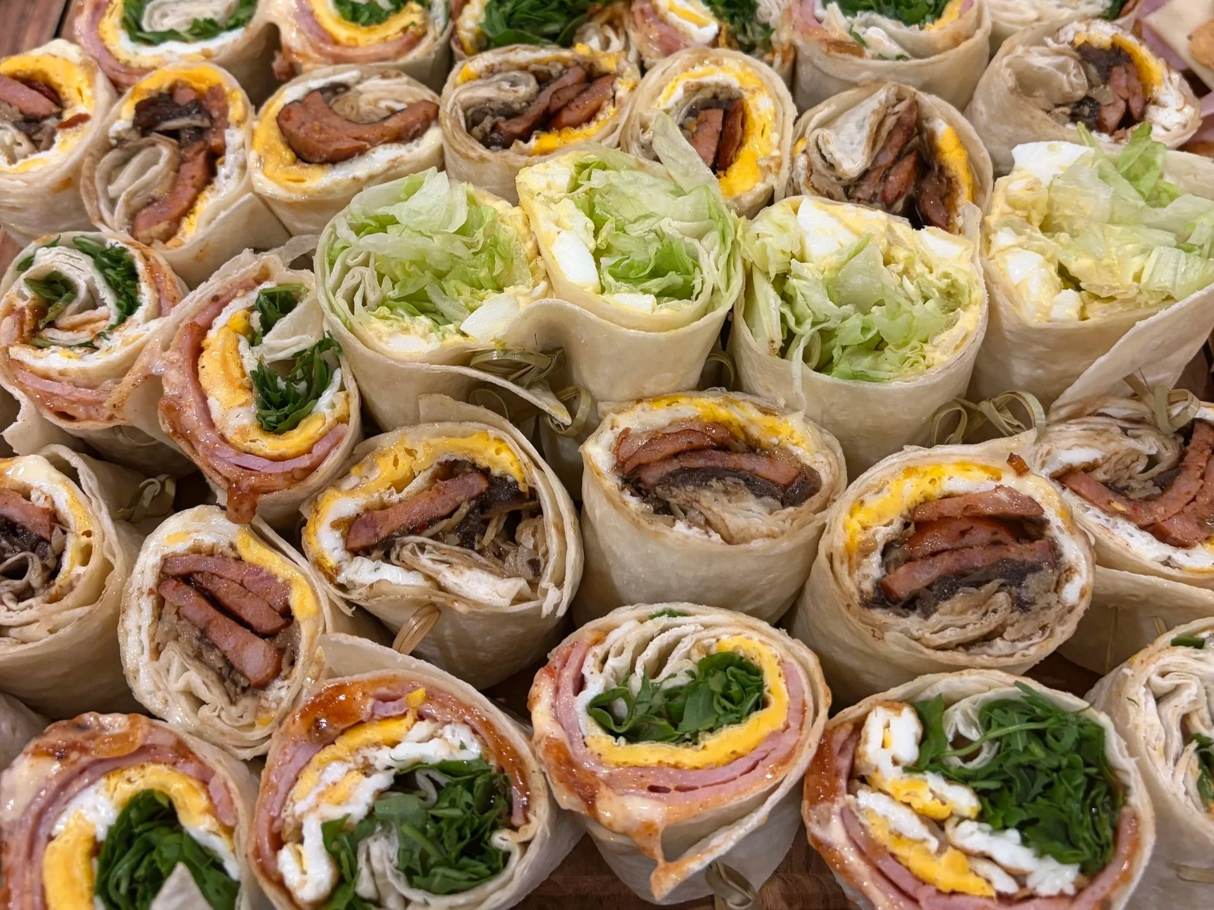 A crowd-pleasing mix of chicken, vegetarian and ham savoury wraps — perfect for lunch meetings or easy finger food.