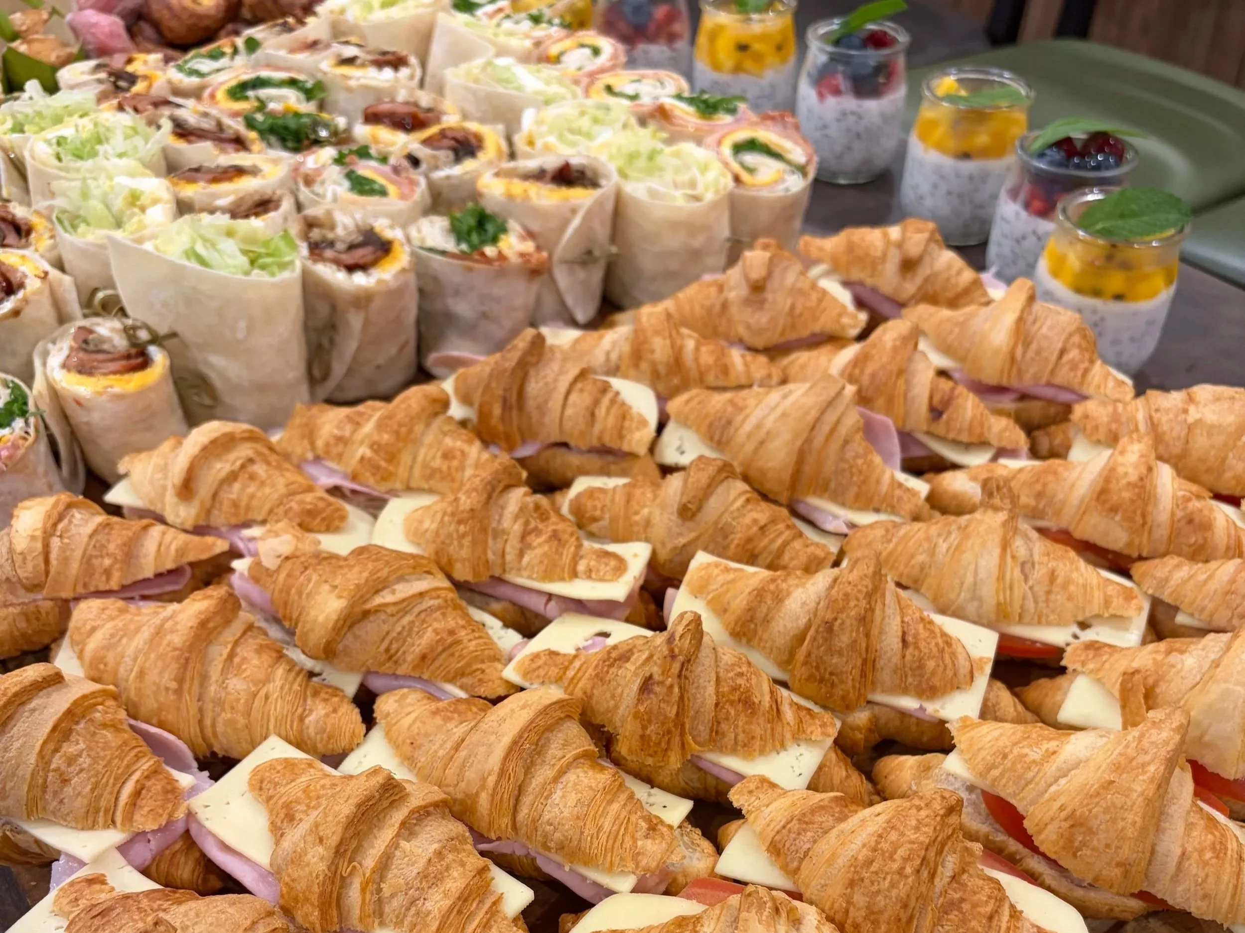 A buttery assortment of mini ham & cheese and tomato & cheese croissants — light, flaky and crowd-pleasing.